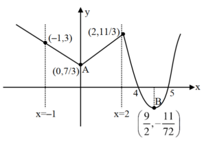 $f(x) = \begin{cases} 1-2x, & x < -1 \\ \frac{1}{3}(7+2|x|), & -1 \le x \le 2 \\ \frac{11}{18}(x-4)(x-5), & x > 2 \end{cases}$