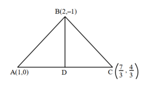 $$BC = \sqrt{(2-\frac{7}{3})^2 + (-1-\frac{4}{3})^2} = \sqrt{(-\frac{1}{3})^2 + (-\frac{7}{3})^2} = \sqrt{\frac{1}{9} + \frac{49}{9}} = \sqrt{\frac{50}{9}} = \frac{5\sqrt{2}}{3}$$