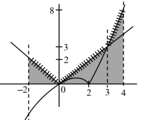 $$A = \int_{-2}^{0} (-x) \, dx + \int_{0}^{1} (2x – x^2) \, dx + \int_{1}^{3} x \, dx + \int_{3}^{4} (x^2 – 2x) \, dx$$