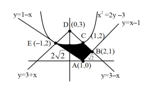 $A = 4 – 2\int_{0}^{1} \left( (3-x) – \left(\frac{x^2+3}{2}\right) \right) dx$.